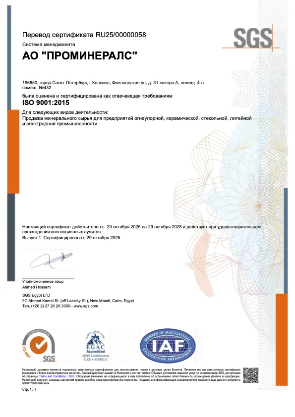 АО «Проминералс» успешно прошло аудит компании SGS и получило сертификат ISO 9001:2015.